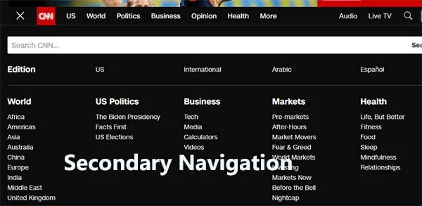 Secondary navigation can be known as the secondary links or the sub categories of the main menu. You can see it either from a drop-down menu or a fly-out menu.